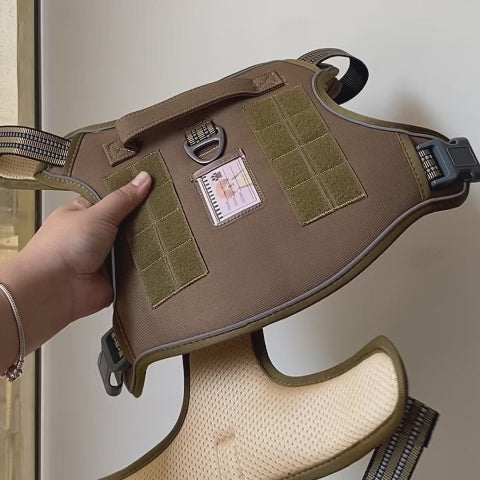 Chaleco táctico para perros, ajuste rápido y cómodo. Material resistente (Nylon 900D), dos anillos de metal, y malla transpirable. Ideal para entrenamiento y paseos.