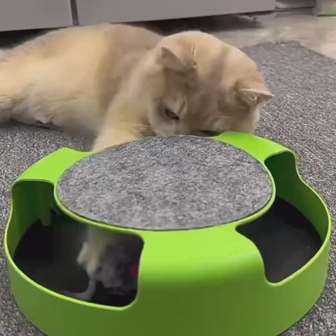 Juguete interactivo con ratón giratorio y rascador. Estimula el instinto de caza y cuidado de uñas. Base antideslizante. Medidas: 25 x 25 x 6.5 cm. ¡Diversión y ejercicio para tu gato!